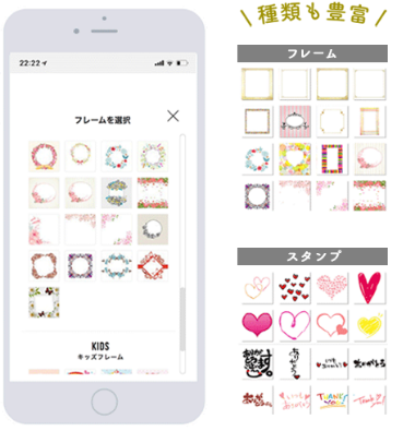 お好みのフレームとスタンプを自由に選択・配置してください。